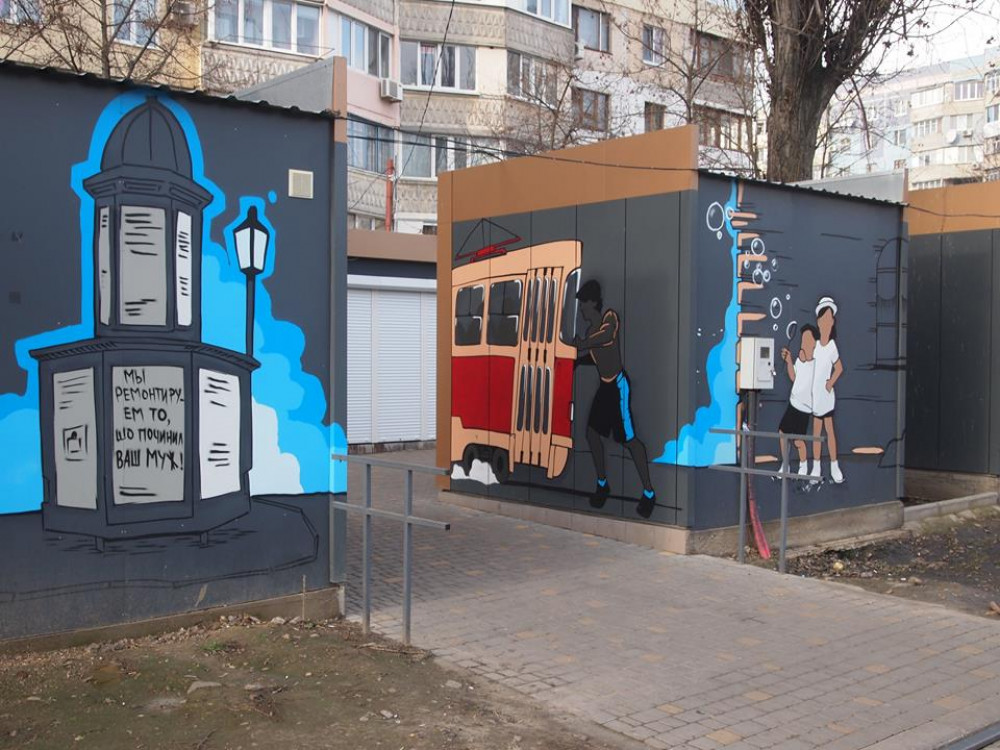 Торговые ряды длиной в километр, появившиеся не так давно вдоль оживленной магистрали нв проспекте Добровольского, теперь уже не пугают своей скучной монотонностью. Их украсили художники. Об этом сообщила одесситка Валентина Князева на своей странице в Facebook.