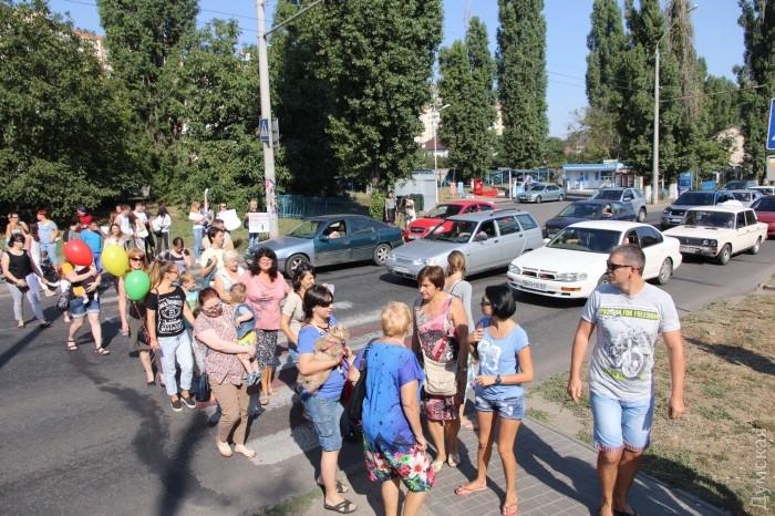 Протестующие требуют установить светофор на опасном участке дороги. На переходе между остановкой "Продмаг" и жилым массивом "Радужный" лишь за последние полгода произошло 5 наездов на пешеходов. Также ночью по проспекту устраивают "гонки" владельцы спортивных машин. На место прибыли чиновники из райадминистрации Киевского района и представители полиции. Пообещали решить проблему.