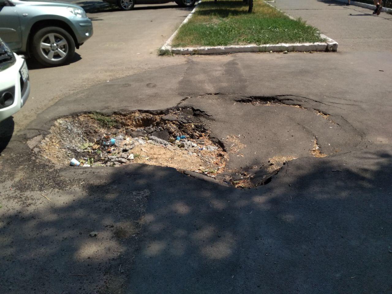 Некоторые провалы достигают в размерах нескольких квадратных метров. В жару асфальт может провалиться еще больше. Некоторые граждане кидают в ямы мусор.