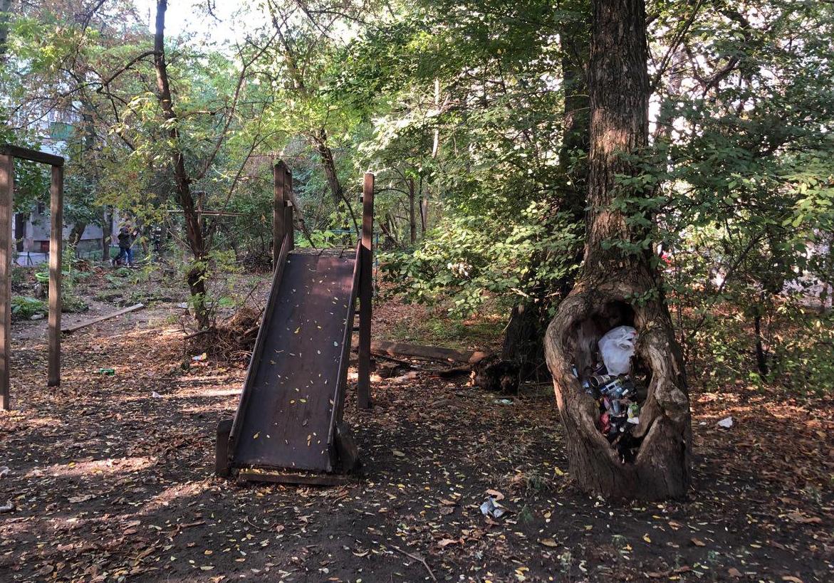 Прогуливаясь по городу наш журналист заметил жуткую детскую площадку с кучей мусора прямиком в дереве, прогнившей горкой и деревянными прутьями.