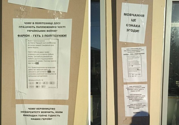 «Почему в политехнике до сих пор работают порочащие честь украинских воинов? Фарион – прочь из политехники», - сказано в одном из них.